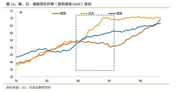 而在居民杠杆率方面1985年-1990年的日德差异同样明显。日本居民杠杆率从1985年至1990年上行了16个百分点;而同期德国居民杠杆率还轻微下降了2.4个百分点;美国则上升了约7个百分点。