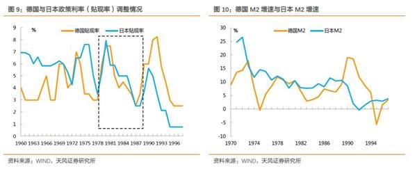 从这一角度来看,我们可以认为日本货币政策表现确实更为积极一些,但如果放在一个更长的周期里似乎很难判断出这一幅度是否过于不合适。两国贴现率在1985-1990年期间调整节奏上的差异明显小于1973-1979年间德国率先降息带来的差异。