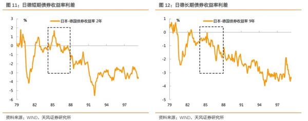 我们如果观察两国短期与长期市场化的债券收益率水平,其实可以发现短期收益率由于更直接受到政策利率的影响,在1985-1988年期间实际上利差水平并未形成趋势,而差异主要体现在长期收益率上,同期日本长债收益率下行更为明显,日德长债利差明显走低。这也能在一定程度上体现出日本货币程度相对更为宽松。问题在于这一利差的波动程度并非“历史罕见”,1979-1982年期间日德利差的波动幅度就明显高于1985-1988年期间。