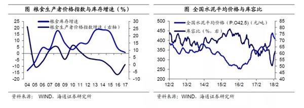 库存与价格的“跷跷板”效应。在判断商品价格走势时,库存通常是很好的观察指标。库存能够反映供需力量的强弱,在库存较低时,反映商品处于供不应求的状态,要么是需求大幅增长,要么是供给持续收缩,而无论哪种情况,均会带来价格的上涨。但如果库存较高,就说明商品供过于求,价格会趋于下跌。因此库存与商品价格之间存在着此消彼长的关系,即“跷跷板”效应。像粮食和水泥等商品,库存与价格之间就存在明显的反向关系,其实就是对“跷跷板”效应的有力证明。