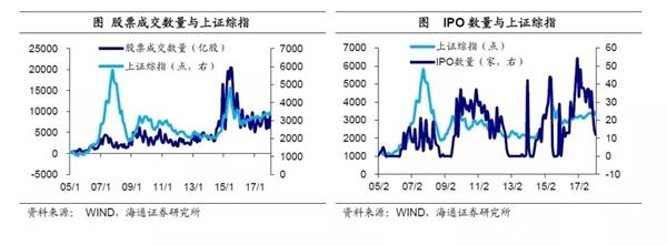 最典型的投资品莫过于股票市场,股票价格就是完全由需求主导,历史上IPO暂停时通常是熊市,而IPO放量时通常是牛市。例如成交数量所代表的股票需求和上证综指的走势高度一致。而反映股票市场新增供给的IPO数量和价格之间的关联性不仅弱于需求因素,并且更多地表现为正相关性,同升同降。我国股票市场上曾经有过IPO暂停的时期,比如13年全年仅上市两家企业,但13年上证综指平均不到2200点,明显是熊市;相反在15年的IPO企业高达223家,而股市则是牛市行情。