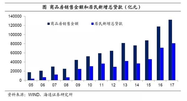 既然人们买房不靠收入,那么只能依赖于举债。而事实上我们也的确观察到,商品房销售金额和居民负债的同步走高。15年居民部门年度新增总负债只有4.6万亿,16年大幅上升至7.1万亿, 17年又再度上升到8.1万亿。居民部门的贷款扩张支撑了地产销售,进而推高住房价格。