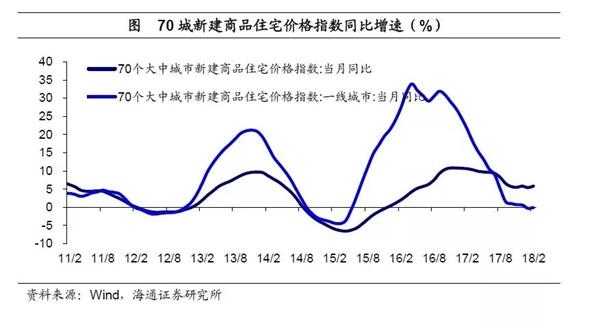 另一方面,房价已开始出现大幅松动。自17年四季度以来,70城新建商品住宅价格指数同比增速已由17年上半年9%以上的高点降至6%以下。特别地,18年前两月一线城市房价同比增速由正转负,创15年6月以来的新低,具有重要的信号意义。这意味着住房投资持续升值预期被打破,吸引力也有所下降,投资需求面临回落。