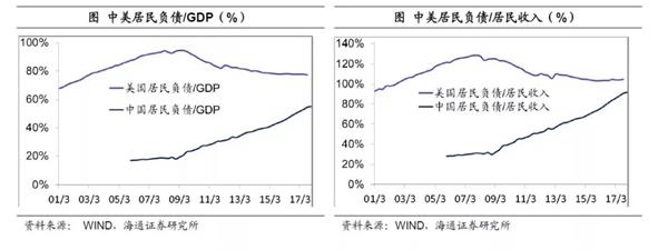 居民负债率被低估,居民举债空间有限。截止17年末,居民部门的商业贷款余额为40.5万亿,再加上5万亿公积金贷款,居民总负债约为45.5万亿,占当年82万亿GDP的比重为55%,貌似依然远低于美国80%的居民负债率水平,居民仍有巨大的举债空间。