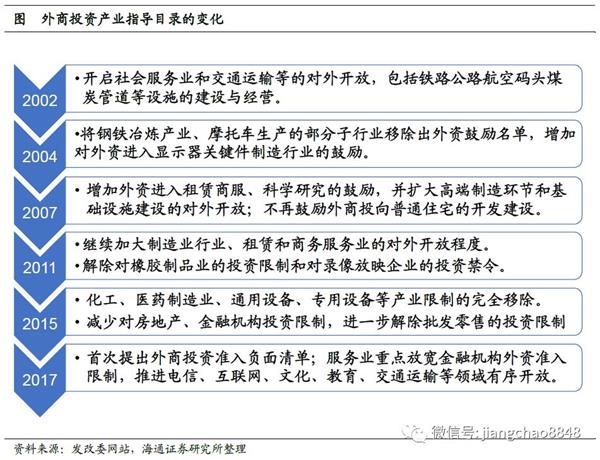 总结过去十多年外资准入,经历了“从制造业到服务业,从重工业到高端产业”的过程。加入WTO后,我国对外资的市场准入经历了逐步有序的放开过程,从国家发改委发布的《外商投资产业指导目录》来看,大体上遵循着从制造业放开到服务业准入的过渡,在制造业内部,由重投资的基建、钢铁等行业逐渐过渡到重技术的高端制造行业。目前对服务业和少数制造业外商投资限制的放开也是在履行我国加入WTO的承诺。