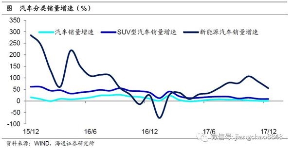 我国城镇居民人均耐用品保有量接近饱和,消费正由物质消费向品质消费转变,汽车行业本身就是一个很明显的例子——2017年汽车行业整体增速几乎为零,但SUV型汽车的增速依然接近20%,新能源汽车的增速更是接近50%。