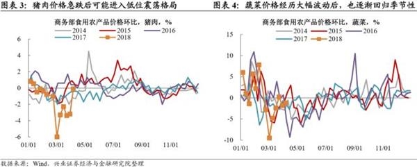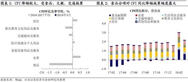 3月CPI环比降幅较大,春节效应减退和前期扰动因素的滞后影响可能是主因。3月CPI环比增速从2月的高增1.2%大幅转至下降-1.1%,数据波动较大的背后可能有两方面因素的共同影响:1)春节错月效应的扰动。此前受春节效应推动走高的文化教育和交通通讯分项3月均出现明显回落(交通通讯分项同时也受到国内下调的一定影响);2)此前临时扰动因素的滞后影响。我们在2月通胀点评《扰动的数据,不安的市场》中也指出,2月CPI食品分项表现与高频数据背离明显,一方面受生猪、蔬菜等批发价格向零售价格传导的时滞有一定影响,另一方面,2月中旬前气温偏低的影响仍体现在2月CPI中。进入3月,随着食品价格下跌的持续传导,以及2月中旬以来天气突然转暖对菜价逐渐转向负面影响,3月食品分项价格的大幅回落对CPI拖累最为明显。