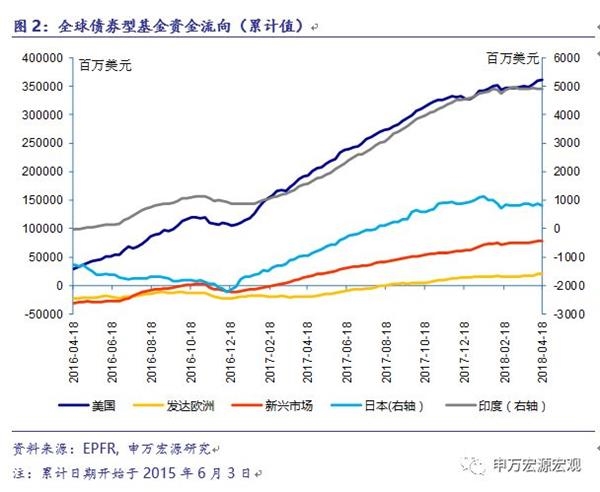 4月18日当周,资金流入美国、发达欧洲、新兴市场的债券基金,从日本、印度流出,其中,美国和发达欧洲分别净流入15.90和6.23亿美元,日本净流出0.61亿美元,新兴市场净流入5.72亿美元,印度净流出0.01亿美元。