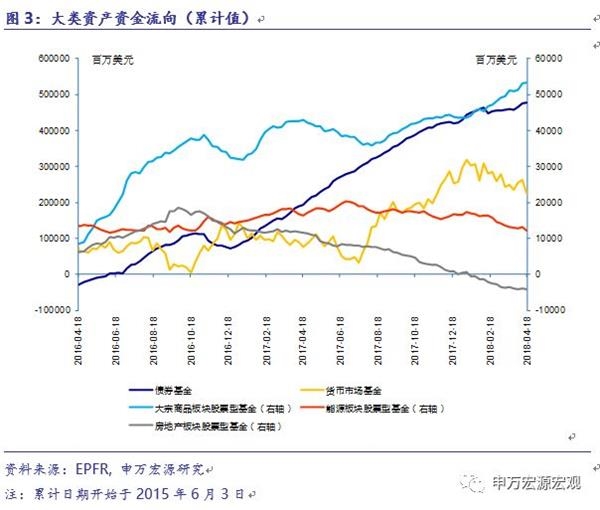 4月18日当周,资金流入债券基金、大宗商品板块基金,从货币基金、能源板块基金、房地产板块基金流出。其中,债券基金净流入27.16亿美元,货币基金净流出375.96亿美元,大宗商品板块基金净流入2.68亿美元,能源板块基金和房地产板块基金分别净流出9.12和1.61亿美元。
