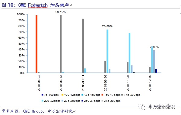 3月21日美联储宣布加息25个基点至1.5%-1.75%,是年内首次加息。4月21日的利率点阵图显示2018年还将大概率加息2到3次。其中,6月份第二次加息的概率为98.4%,9月份第三次加息的概率73.8%,年末第四次加息概率38.6%。