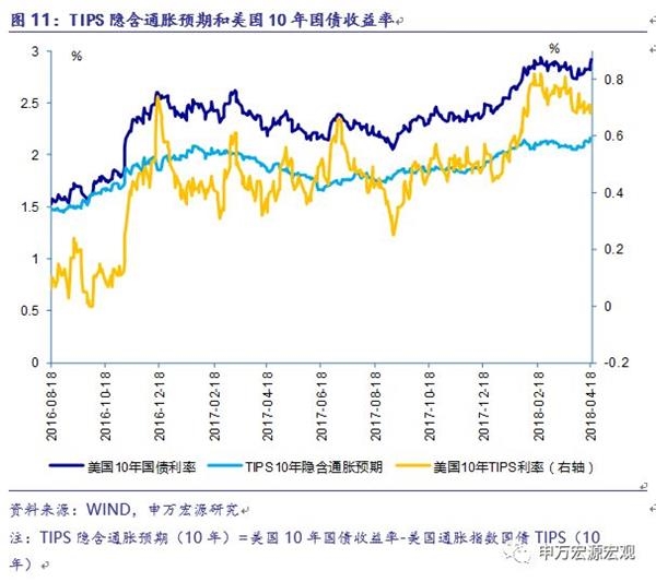4月18日,美国10年期国债利率收于2.87%,高于前周的2.79。同日,TIPS隐含通胀预期为2.16%,和前周相比上升了5个基点。