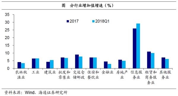经济企稳主要归功于新经济。经济层面,17年下半年以来GDP增速稳定在6.8%超预期,受工业增速持续下滑拖累,第二产业增加值增速从上半年6.6%降至下半年的5.8%,而服务业的超增全部来源于信息服务业。18年1季度GDP增速持平在6.8%,服务业的贡献率继续上升并超过60%,但服务业各子行业增速普遍较17年下滑,唯有代表新经济的信息服务业增速继续走高并接近30%。