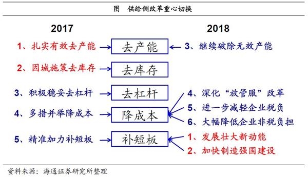 从去产能、去库存到补短板。政策层面,也同样发生了变化。过去两年,供给侧结构性改革的重心是去产能和去库存。去库存令地产销售、投资相继回升,拉动工业需求,而去产能导致供给收缩,抬升工业品价格,并带动工业企业盈利改善,两者的落脚点都是“旧经济”。但今年3月全国两会《政府工作报告》中明确将“发展壮大新动能”和“加快制造强国建设”列为18年供给侧结构性改革首要目标,标志着供给侧改革的重心已从去产能、去库存转向补短板。