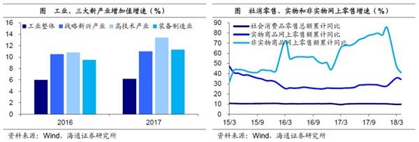 新产业、新业态正在加速发展。新产业方面,16、17年战略新兴产业、高技术产业、装备制造业的增加值增速均在10%左右,远高于6%的工业平均增速,且17年相较16年仍在上升,其中高技术产业中的业和制造业增速均在13%左右。新业态方面,17年实物商品网上零售额增速上升至28%,远高于社消零售总额10%左右的增速,而非实物商品网上零售额增速更高。