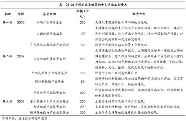 起步阶段(2005年-2008年)的产业投资基金发展有两条主线:一是以06年渤海产业投资基金为代表的发改委批复的三批共计十只“产业投资基金”;二是依据05年发改委等十部委联合发布的《创业投资企业管理暂行办法》成立的“创业投资引导基金”。这一时期的产业投资基金均以地方政府发起设立为主,计划规模普遍在100-200亿元左右,投资方向上主要结合地方各自的产业特点;而另一类创业投资引导基金主要服务于创业企业,采用的是母基金形式,这类基金对创业企业的支持事实上也体现出产业政策的导向。