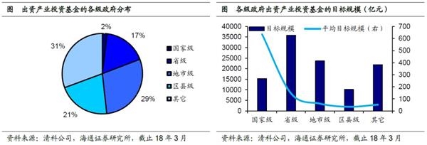 国家级大基金撬动地方资金。中央政府已经充分意识到政府产业投资基金的撬动作用,因此通过设立少量的大基金模式来引导地方及社会资金,以实现产业发展目的。在单支基金的规模上,国家级基金平均目标规模高达635亿元,要远超省级政府产业基金的145亿元。但在总体规模上,地方政府才是产业投资基金的主力。截止18年3月,国家级基金目标规模约为1.5万亿元,而省市区三级地方政府产业投资基金目标规模合计约7万亿元,总体来看国家资金撬动的地方资金比例约为1:4到1:5。