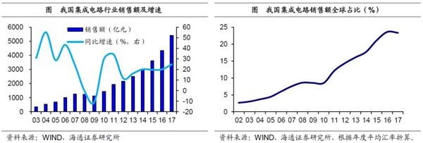 制造和设计子行业的高增速有力地支撑了我国集成电路行业的增长。14年以来我国集成电路产业销售额增速基本维持在20%以上的水平,17年行业销售额已经达到5400亿元。15年我国集成电路产业销售额全球占比由14年的17.7%一举提升至21.1%,16和17年的占比更是超过了23%,大基金在其中的作用功不可没。