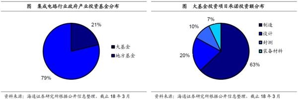 大基金一期实际募资1387亿元,而由此撬动的地方集成电路产业投资基金5145亿元左右,撬动的地方产业投资基金比例在1:3到1:4之间。从大基金的投资项目上看,主要集中于集成电路行业中的制造和设计方向,其中制造部分投资额占比约为63%,设计部分占比20%。