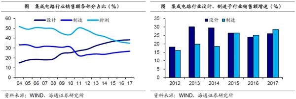 得益于大基金的投入,2015年以来设计和制造子行业在我国集成电路行业中的占比不断提升,增速也保持在了较高水平。17年设计和制造子行业销售额在我国集成电路行业中的占比均较14年提升3个百分点以上。15-17年两个子行业销售额的平均增速也在25%以上,特别值得一提的是,15年制造子行业的增速由14年的不足20%提升至27%,增长非常明显。