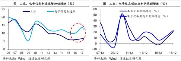 三是助力升级。产业投资基金投向主要是战略新兴产业、高技术产业等新产业,而这些增速普遍较快,增加值和利润率较高,但体量偏小。比如电子信息制造业,17年增加值增速为13.8%、远高于6.6%的工业平均水平,利润总额增速23%、也高于21%的工业平均水平,但仅占规模以上比重的7.7%。较高的投资回报率将会激励更多的产业投资基金投向新兴产业,最终带来行业的发展壮大和转型升级。