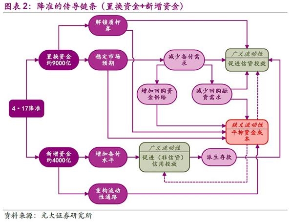 人民银行于4月17日宣布的降准即采用的是这个思路。在4月22日的报告《降准后,还能不能入场》中我们曾指出,本次降准的主要目的是为了提供稳定且低成本的资金以便促进信贷的合理投放(特别是对下游小行而言),而非应对实体部门的下行风险。对于“促进信贷”这个目的,降准所释放的置换资金和新增资金的传导渠道略有不同:对于9000亿元的置换资金,其主要通过解锁质押券、稳定市场预期这两个链条进行传导。对于4000亿元新增资金,其可以通过增加备付水平以及“重构流动性通路”进行传导。