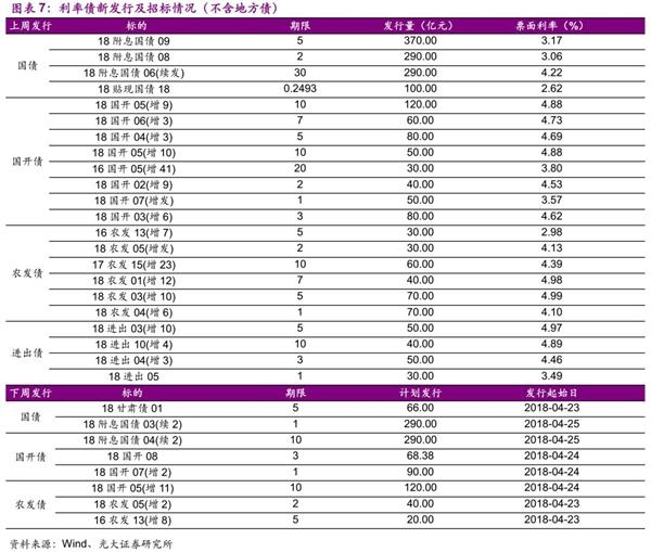 下周(2018年4月23日至27日)利率债发行方面,从目前公告来看将发行2只国债、3只农发债、3只进出债,计划发行规模958.38亿元。计划发行地方债1只,规模66亿元。