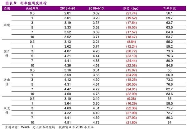 相较于2018年4月13日,4月20日利率债收益率全部下行,下行最大的为7农发债,收益率下行27.93bp。