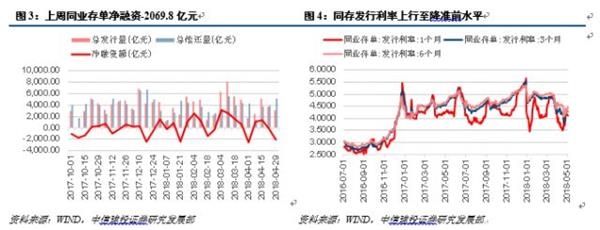 上周(4月23日至4月29日)总计发行同业存单453期,实际发行3071.1亿元,同业存单到期5141.9亿元,周内同业存单净融资-2070.8亿元,周内同业存单发行大幅回落,净融在上上周跌入负值后,负差进一步扩大。本周同业存单到期3620.9亿元,到期压力缩减,叠加月初资金面宽松,同存发行需求或继续回落。4月份央行降准增加了银行低成本资金,可能降低了相对高成本的同业负债的需求,进入到5月份,同业存单到期压力不减,降准后银行主动负债需求是否延续回落,仍待进一步观察。