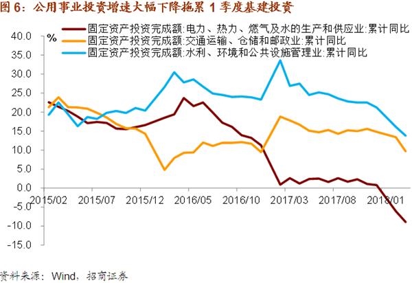 从基建投资结构上看,1季度拖累基建投资增速的主要是投资。1季度公用事业投资同比下降6.8%,跌至历史最低水平,跌幅远大于交运仓储和邮政业以及水利、环境和公共设施管理业。