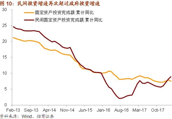 2016年之前,民间投资增速长期快于政府投资增速,而2016-2017年政府投资对民间投资造成了较为明显的挤出效应。随着政府投资的放缓和收入分配政策重新向企业部门倾斜双重利好,我们预计今年民间投资将重新崛起,其在总体投资中的占比将持续回升。