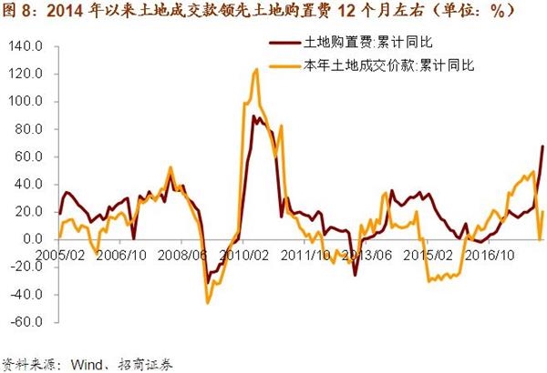 2010至今,年度地产投资增速与年度土地成交价款和土地购置费之间存在一个有趣的相关关系,即地产投资增速与土地成交价款和土地购置费之差相关性较为明显。为什么会有这样的相关性,原因就在于土地成交价款在房地产投资过程中是领先于土地购置费。地产投资下行周期时,土地成交价款先于土地购置费下滑,二者之差也呈现下降态势;地产投资上行周期时,土地成交价款先于土地购置费回升,二者之差自然也呈现上升态势。尽管前两月土地成交价款跌至0零增长,但1季度迅速反弹至20.3%,土地购置面积增速也由负转正。因此,我们认为2季度地产投资增速可能仍有继续上升的可能性。