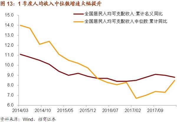 随着房价涨幅的放缓,我们看到今年1季度收入中位数增速与收入平均数差距缩小。1季度居民人均可支配收入的中位数增速大幅反弹,为8.5%,仅比同期收入平均数增速低0.3个百分点,较去年同期中位数增速加快1.8个百分点。这显示居民收入差距可能正在缩小。当前收入分配政策不再向居民部门倾斜,而居民收入差距收窄将成为消费需求继续扩张的新动能。
