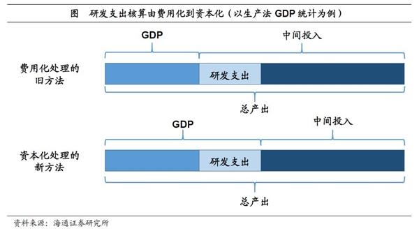 研发纳入资本形成,不再计入中间投入。以生产法下的GDP统计为例,国内生产总值等于总产出减去中间投入。在旧的核算方法下,研发支出被计入中间投入部分,在生产法统计下属于扣减项,因此旧方法下国内生产总值中并不包含反映创新活动的研发开支。而新的核算方法下,将能够为所有者带来经济利益的研发支出作为固定资本形成,不再将其计入中间投入而加以扣除。新方法将研发活动计入国内生产总值,反映了统计核算对经济增长动能切换的适应和调整。