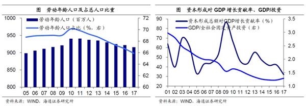 人口资本贡献趋缓,旧动能式微。从供给端看,劳动力、资本、技术是经济增长的三大要素。工业化时代,中国经济高速增长主要由劳动力和资本驱动。但随着工业化步入尾声,拉动经济增长的两大旧动能疲态已现。一方面,中国劳动年龄(15-59岁)人口数量及占总人口比重均在11年左右见顶回落,17年劳动年龄人口占比已降至65.9%。另一方面,资本形成对GDP增长的拉动自09年以来持续回落,17年已降至32.1%,创下01年以来新低,而投资的投入产出比(GDP/全社会)更是一路下滑。