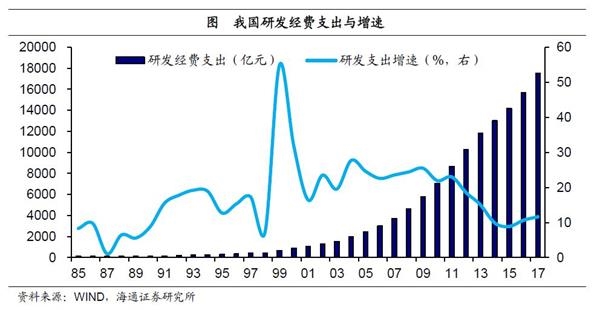 研发支出持续高增长,目前已颇具规模。中国研发支出规模在85年突破100亿大关,此后进入了高增长阶段,自91年以来,每年研发支出增速基本保持在两位数。其中01-10年是中国研发投入的黄金十年,每年研发支出增速均在20%以上,研发支出规模也从01年的1000亿左右,上升至12年的1万亿以上。过去几年研发支出增速经历了从放缓到企稳的过程,目前稳定在10%左右,而17年研发支出也已达到1.75万亿元。
