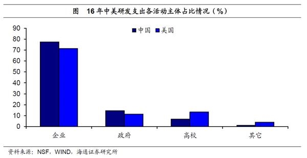 企业研发占大头,美国高校占比高。中美两国研发支出的活动主体中,企业部门均占绝大多数,16年美国企业部门在研发经费支出中占比超过70%,中国企业部门更是高达77%,超过美国约6个百分点。但另一方面,美国高校部门的研发支出占比要远高于中国,16年美国高校研发支出占比超过13%,而中国只有7%左右。
