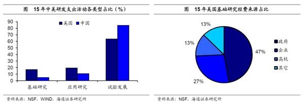 我国基础研究投入程度不足。企业经营的目的在于实现利润最大化,这就决定了企业在研发投向上更加侧重于应用型研究,而对短期难以带来直接收益的基础研究关注程度不够。我国企业在研发支出中的高占比,导致了基础研究领域研发投入的不足,15年美国基础研究经费投入占比16%,超过中国10个百分点以上。而政府和高校是美国基础研究经费的主要来源,企业在基础研究经费中的占比只有27%,远低于在研发总支出中70%以上的占比水平。