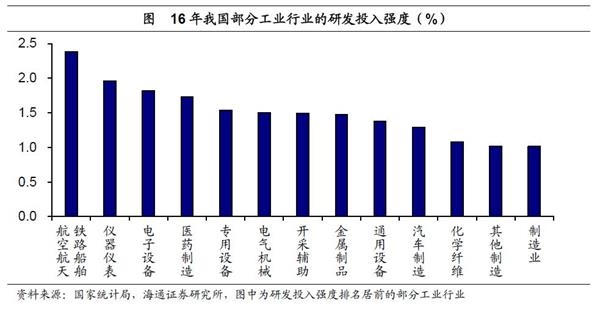16年规模以上工业企业中,制造业研发投入强度为1.01%,其中铁路、船舶、航空航天和其他运输设备制造业以2.4%的高研发投入强度居首,其它如制造业、制造业等装备制造行业排名也均靠前。计算机、通信及其他电子设备制造业和业以超过1.7%的研发投入强度排在前五之内,均远超制造业研发投入强度的平均水平。在我国大力推动科技创新的背景下,重点支持的高技术制造业也正是研发投入强度较高的电子、医药和装备制造行业。