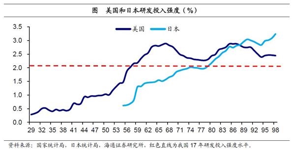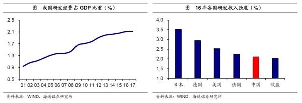 研发投入空间巨大,高速增长正值中游。17年我国研发投入强度2.12%,相当于美国50年代末60年代初以及日本80年代初的水平。而两国创新发展的历史经验均表明,这一水平正处于研发投入高速增长时期的中游,随后美国和日本分别于67年、90年达到研发投入强度的顶点。对照美日的经验来看,我国研发投入强度离3%的顶点尚有巨大空间,在下一个十年还可以保持旺盛的增长势头。
