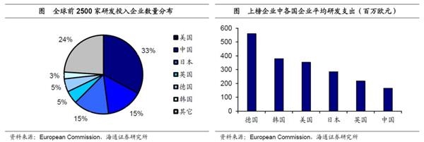 高研发企业已成气候,但平均支出规模偏低。微观企业层面,中国企业在国际上又处于怎样的地位呢?根据欧盟公布的16-17年全球前2500家研发投入企业排行榜,美国企业上榜数量最多,超过三分之一,而我国上榜企业数量仅次于美国,以15%的占比位居第二,略高于日本,可见我国高研发企业在数量上已成气候。但我国企业的平均研发支出规模偏低,在上榜企业中,德国企业以平均约5亿欧元的研发支出排在首位,其它发达国家企业的平均研发支出规模也普遍在2亿欧元以上,而我国企业平均研发支出规模只有1.6亿欧元左右,不到德国的30%。