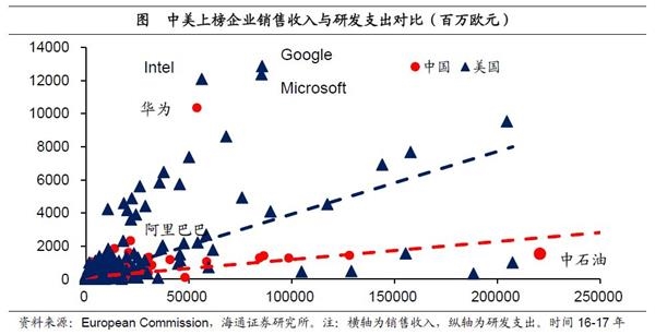 研发投入强度尚可,但与美国差距仍大。从研发投入强度(企业研发支出/主营业务收入)看,中国上榜企业与发达国家相比处于中等水平。我国企业研发投入强度的中位数约在4%左右,超过日本(3.6%)和韩国(2.7%),但较美英德相比,投入强度仍低,特别是相比于美国上榜企业高达12.4%的研发投入强度中位数,差距显著。从分布来看,中国上榜企业普遍销售收入不足500亿欧元,研发支出鲜有超过20亿欧元,等规模较大但研发投入强度偏低的巨无霸拉低了中国企业的平均研发投入强度。从代表性企业看,美国研发投入强度较高且研发支出超过100亿欧元的企业有、谷歌和三家,而中国仅有华为一家。