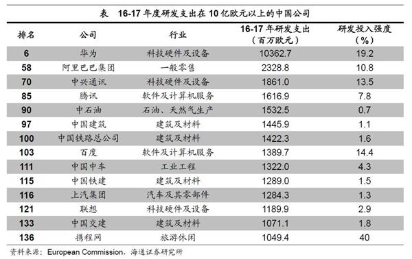 华为一枝独秀,IT、“铁公基”平分秋色。华为是我国创新企业的标杆,在欧盟的排行榜中,16-17年度中国仅华为一家公司以超过100亿欧元的研发支出规模进入前10,其研发投入强度也接近20%,而位居其后的中国公司集团,16-17年度研发支出规模不足25亿欧元,不及华为的四分之一。在16-17年度研发支出10亿欧元以上的中国公司中,IT和交运建筑行业分别占比近半,平分秋色。