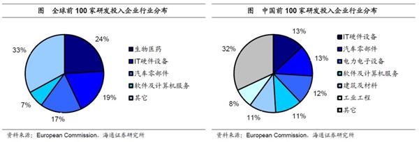 高研发IT企业突出,生物医药薄弱。在我国百强研发企业中,IT软硬件行业合计占比约为24%,与全球百强研发企业中IT行业26%的占比相差不大,可见我国IT企业研发水平在全球已具备一定的竞争力。但全球百强研发企业中,生物医药行业以24%的占比居于首位,而我国生物医药行业在百强企业中占比却不足5%,说明我国生物医药企业研发仍显薄弱,与世界领先水平差距明显。此外,我国高研发企业中建筑工程行业占比过大,与我国以往靠基建等投资拉动经济发展模式也不无关系。