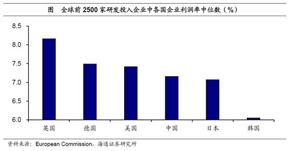 高研发企业利润水平中等,与发达国家相近。在上榜的高研发企业中,我国企业的利润率中位数为7.16%,处于发达国家的中游水平,高于我们的亚洲邻居日本和韩国,不及美英德等欧美发达国家。但我们与欧美发达国家的高研发企业利润率水平差距不大,美国和德国企业利润率中位数均未达7.5%,我国与其差距不足0.5个百分点。