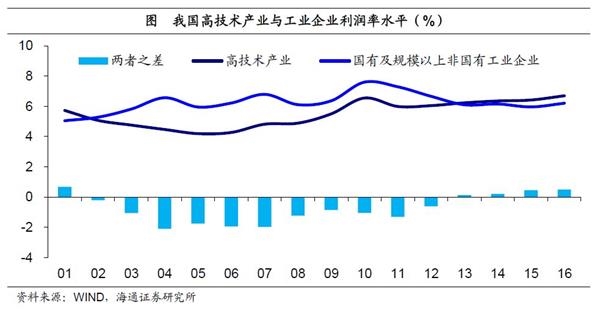 长期来看,研发提升企业盈利水平。根据微笑曲线理论,研发是产业链上占据高附加值的部分,因此,研发活动能够提升企业的盈利水平。工业化时代,企业盈利由投资主导,研发对盈利的贡献相对有限,高技术产业利润率尚不及工业整体。但13年以来,高技术产业利润率反超工业整体,且差距逐渐拉大。16年我国高技术产业利润率6.7%,较全部国有及规模以上非国有工业企业利润率(6.2%)高出0.5个百分点。虽然我国高研发企业利润率与发达国家相比仍然存在差距,但随着研发投入强度的提升,企业盈利水平有望进一步提高。