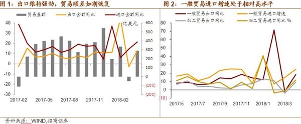 (3)4月贸易差额为287.8亿美元,如期恢复顺差,但由于进口较强,贸易顺差规模比去年同期低76亿美元。整体贸易顺差较窄的重要影响因素之一是原油天然气进口额的上升:原油、天然气进口量价齐升关系,4月原油、天然气进口额比去年4月提高了约56亿美元、10亿美元,并且其进口不一定全然对应着当期需求,可能也有部分用于战略储备。