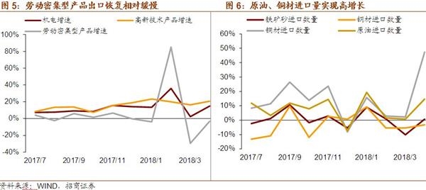 (2)4月进口同比21.5%,同样好于预期,人民币值同比增速为11.6%,加工贸易进口的强劲和原油、天然气进口量价齐升是主要推动因素。4月来料加工、进料加工进口增速分别为14.3%、12.1%,集成电路进口额同比增速为35.5%;4月原油进口量3950万吨,同比增长14.9%,进口额同比增长43%,1-4月天然气进口额同比增长也较高,达到66%。其他原材料方面,铁矿砂进口量为8292万吨,环比有所回落,同比为0.3%,或是受到整体投资需求回落的滞后影响。