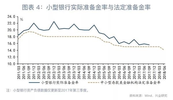 上图显示,2014年以来小型银行实际准备金率持续下降。这一下降过程可以分为两个阶段:在第一阶段,即2014年至2015年,实际准备金率下降的主要驱动力是法定准备金率的下调。2014年6月涉农及小微贷款占比达标的商业银行获得0.5个百分点的定向降准。2015年中小存款类金融机构法定准备金率累计下调2.5个百分点,涉农及小微贷款占比达标的城商行和非县域农商行累计获得1个百分点的定向降准。