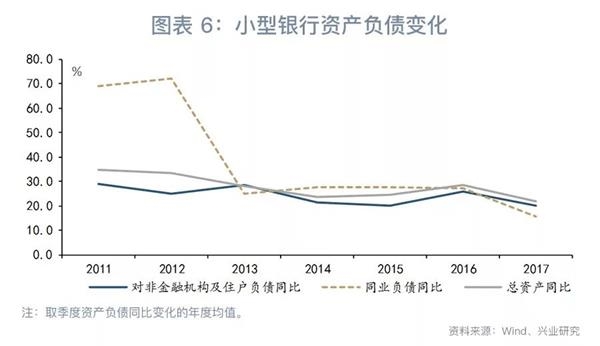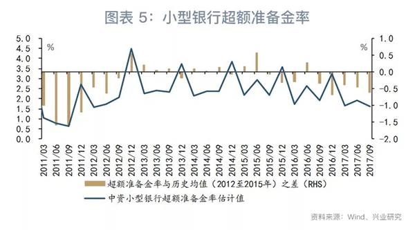 造成这一现象的原因,是2016年与2017年小型银行存款增速与同业负债增速双双低于总资产增速,使小型银行不得不通过消耗超额储备来支撑资产的增长。从负债端看,M2增速的放缓使小型银行存款增速从2015年的20.2%略微下降至2017年前三个季度的20.0%,金融去杠杆使小型银行同业负债增速从2015年的27.4%大幅下降至2017年前三个季度的15.7%。从资产端看,2016年以来经济的回暖使贷款需求较为旺盛,同业资产增速虽然显著放缓却仍然在20%以上。