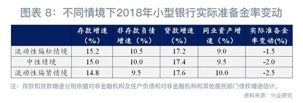 据此可以估算不同情境下小型银行实际准备金率水平的变化。假定小型银行2018年存款增速较2017年放缓,但贷款增速接近2017年,同业资产和非存款负债增速显著放缓,实际准备金率需要较2017年低1.5至2.5个百分点。实际准备金率的变化既包括法定准备金率的变化,也包括超额准备金率的变化。考虑到2017年超额准备金率水平已经偏低,2018年继续降低的空间不大,实际准备金率的这种变化更有可能是法定存款准备金率变化带来的。由于2018年4月已经调低法定准备金率1个百分点,年内或许仍有0.5至1.5个百分点的降准空间。